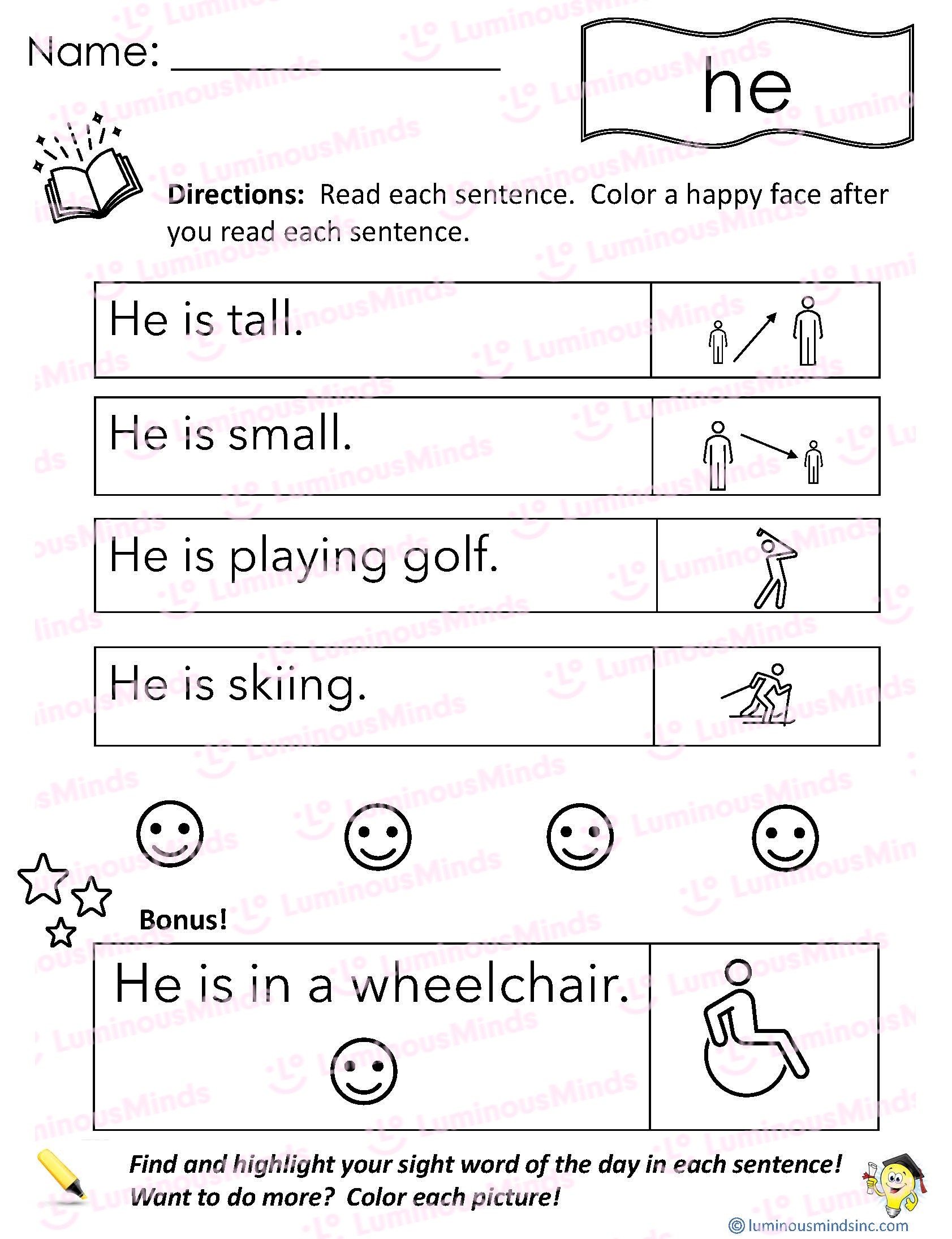 With colorful images and interactive activities, these sight word he worksheets will help your child practice recognizing and reading the word “he” in a variety of contexts. From tracing and writing exercises to matching games, there are plenty of opportunities for hands-on learning.